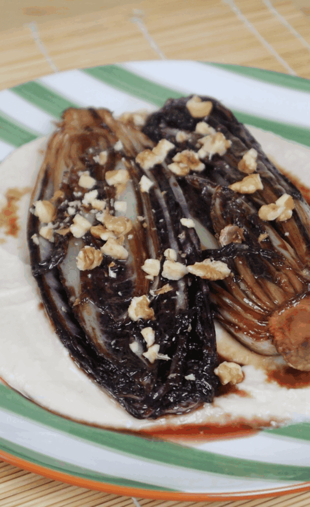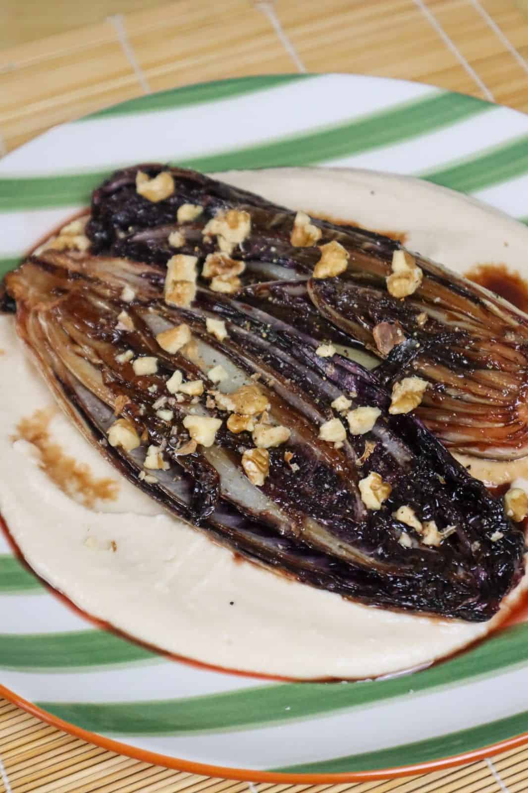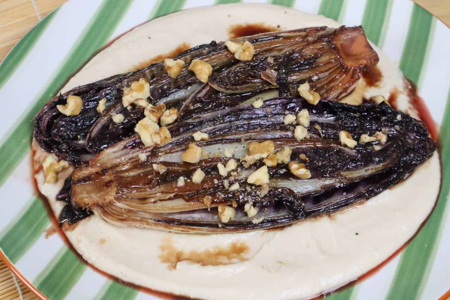 - Spread the bean purée on a plate, top with the balsamic radicchio, and finish with walnuts, salt, pepper, and any remaining liquid from the pan.a handful of walnuts, roughly chopped