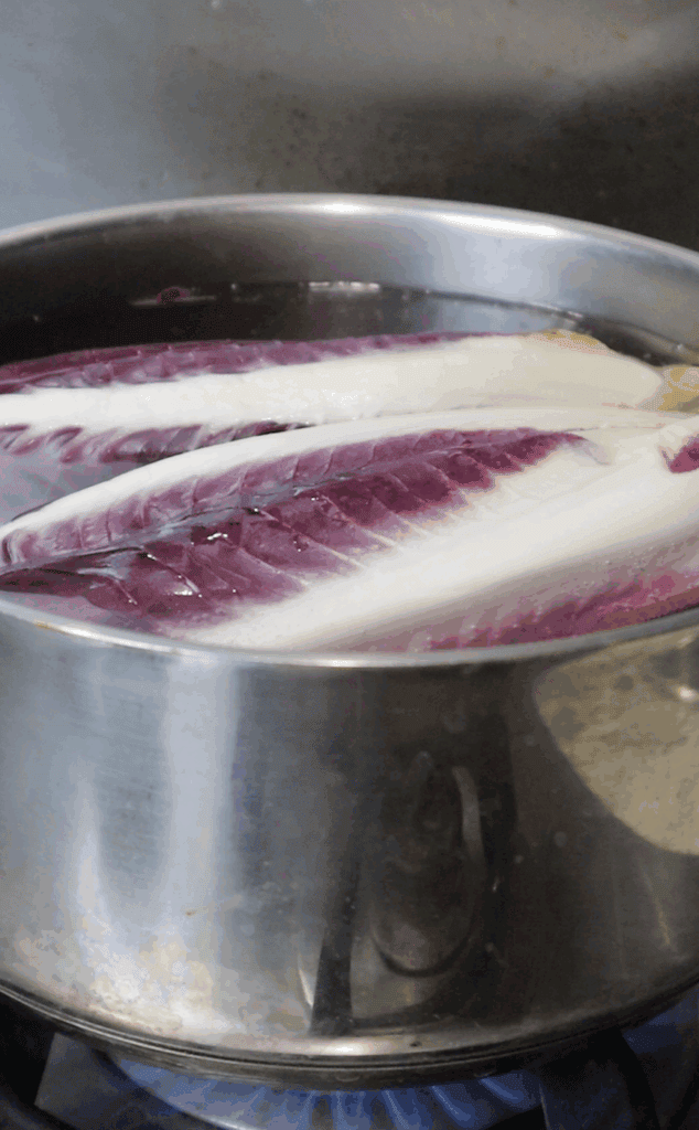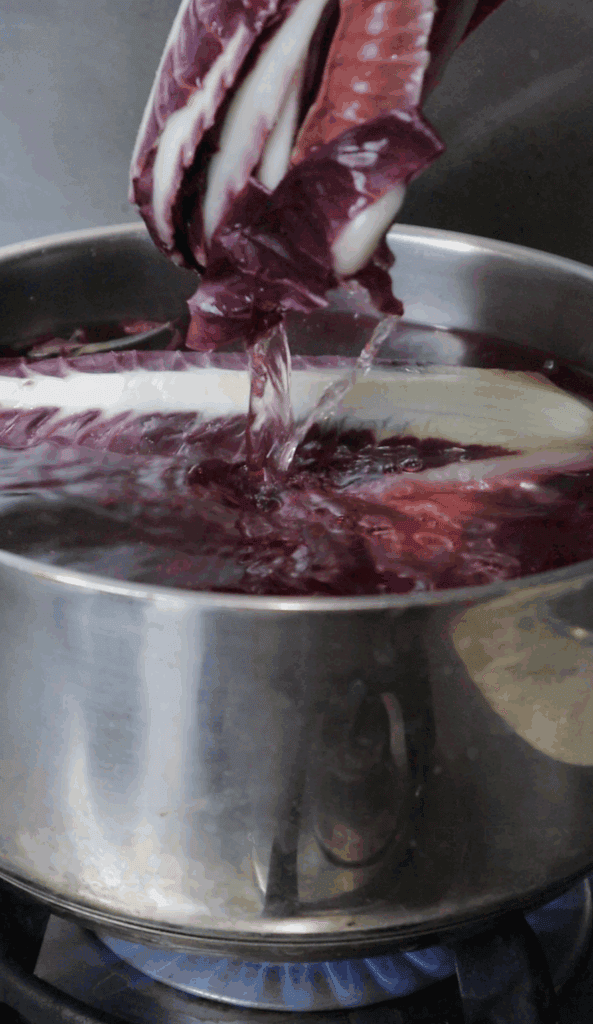 Boil a pot of water with a splash of apple cider vinegar. Add the radicchio and cook for 1 minute.