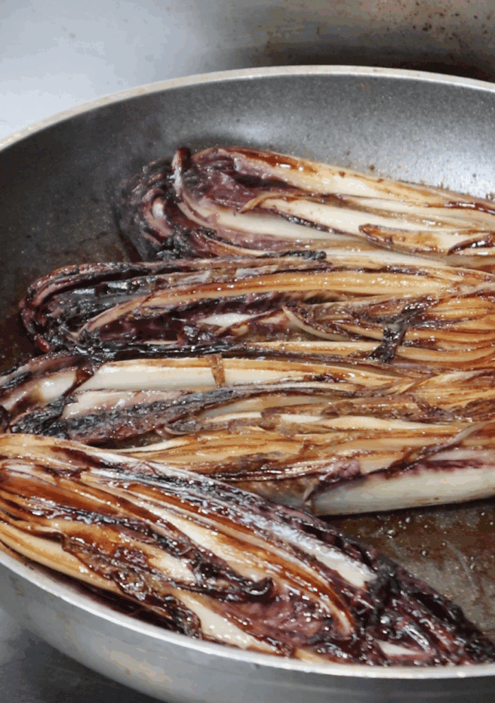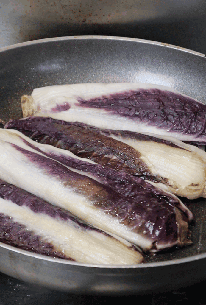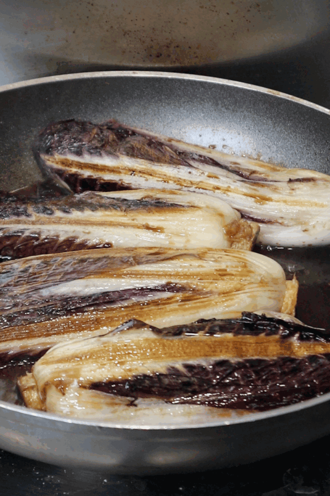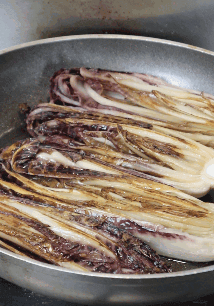 - Cook the radicchio cut-side down until golden, then flip and cook the other side.