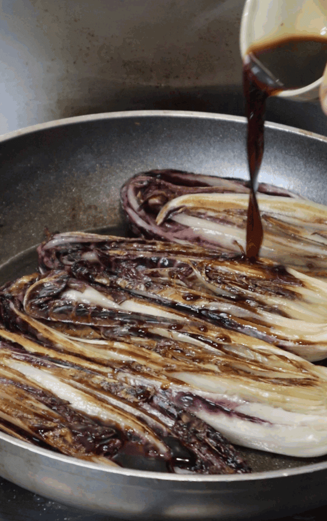 Combine balsamic vinegar, water, and sugar. Pour it into the pan and let it bubble and reduce, coating the radicchio in a stickier balsamic glaze. Turn the radicchio halfway through to ensure it absorbs all that flavor. There isn't meant to be loads of liquid, just a little bit, reduced.