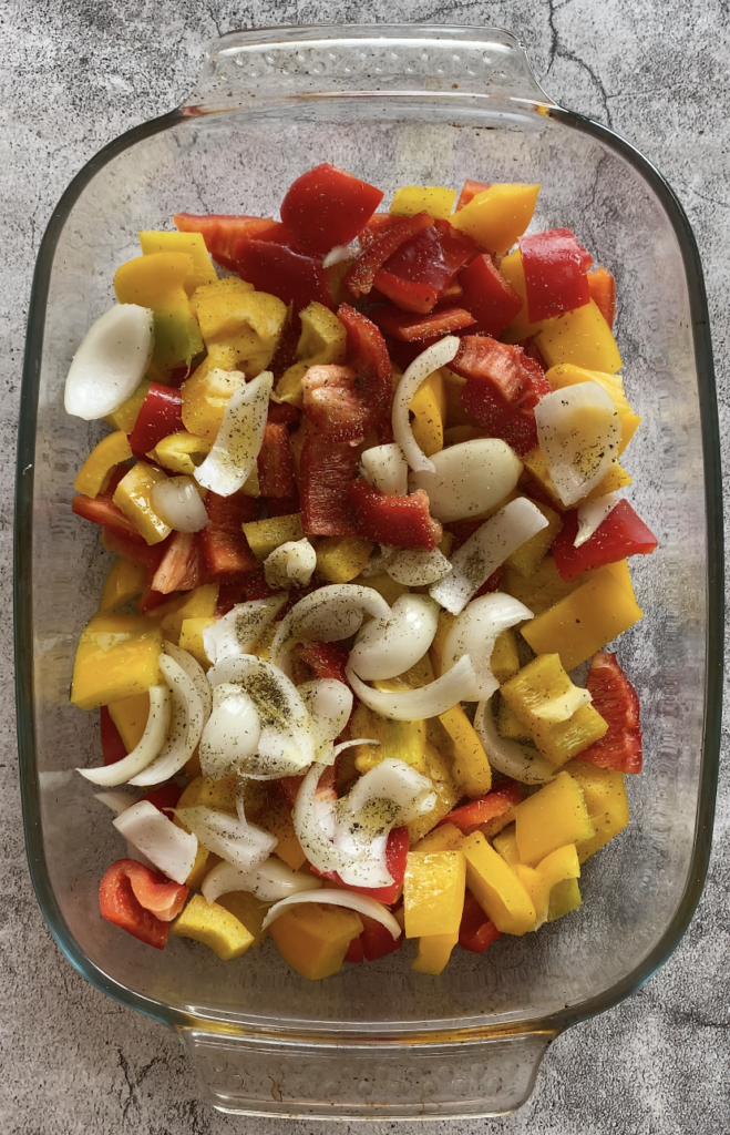 - Cut the peppers in small pieces(¾ cm), cut the onion roughly and peel and crush the garlic. Place in a baking tray, season with olive oil, salt and pepper and mixed herbs. Mix to combine and cook in the oven for 15 minutes at 210C or until cooked.