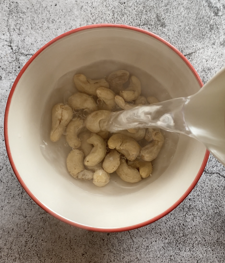 2. In the meantime soak the cashews in hot water and boil the pasta al dente. Keep some pasta water aside in case you need it later.