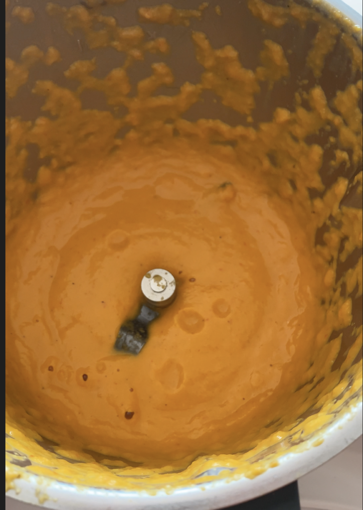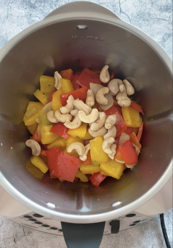 3. Once the peppers, onion and garlic are ready put everything in a blender, add cashews, plant milk and season to taste and blend until smooth. (If it helps add one pasta water)