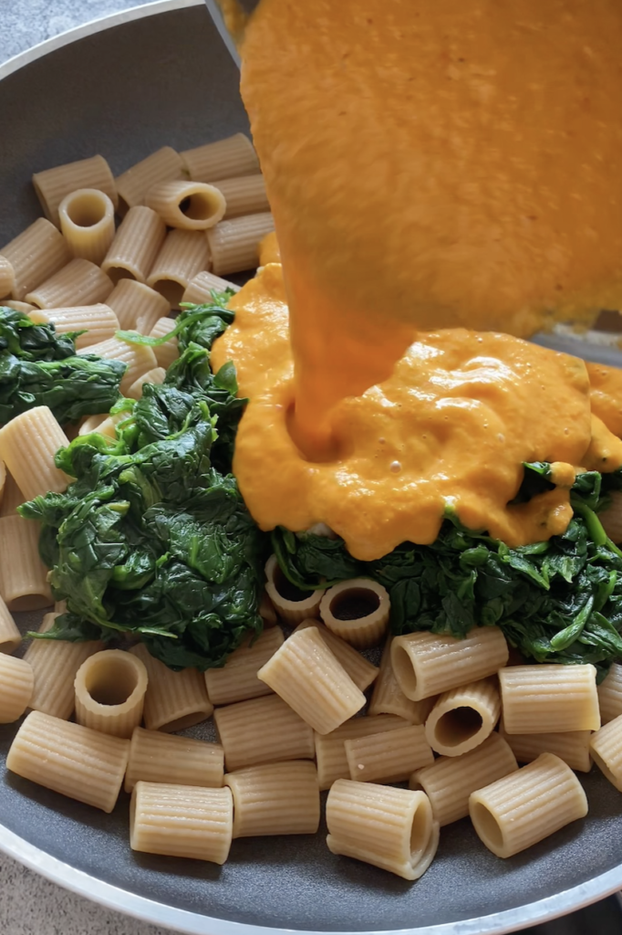 This roasted red pepper pasta is super indulgent and full of flavour. It is served with perfectly al dente wholemeal pasta and spinach to give it some texture.