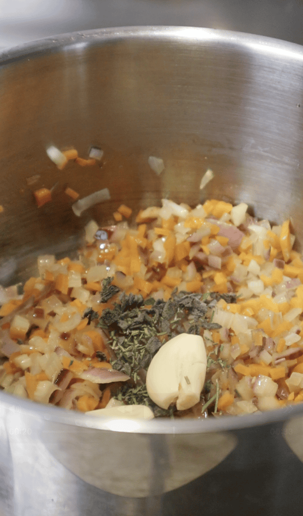 Stir in chopped rosemary, sage and crushed garlic. Cook for about 30 seconds to release their essential oils without burning them.