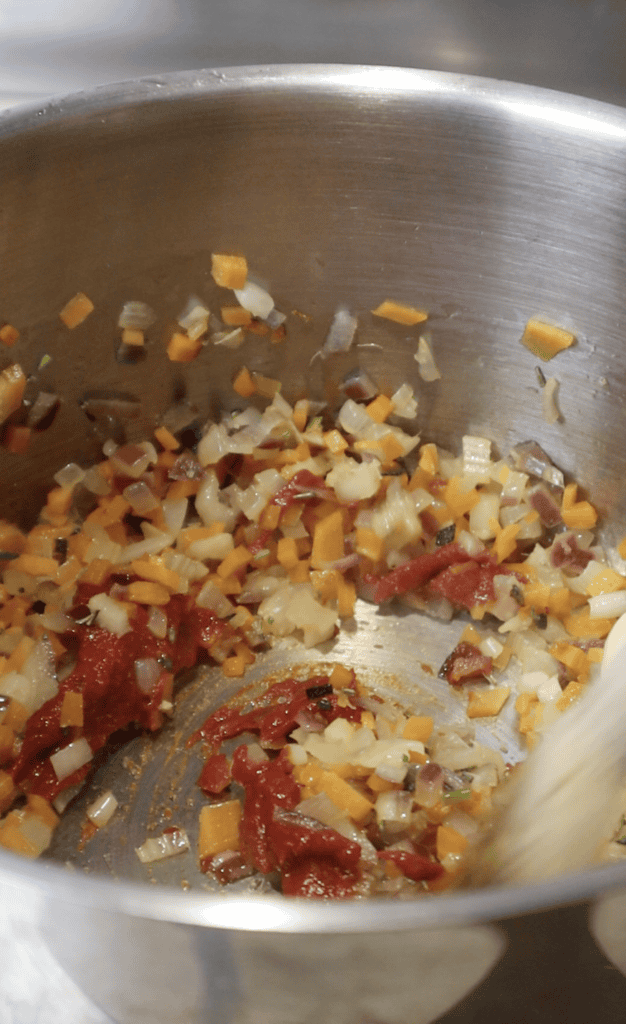 Add tomato paste and thinly sliced cavolo nero. Cook for about 3-4 minutes, stirring until the kale softens slightly and deepens in color.