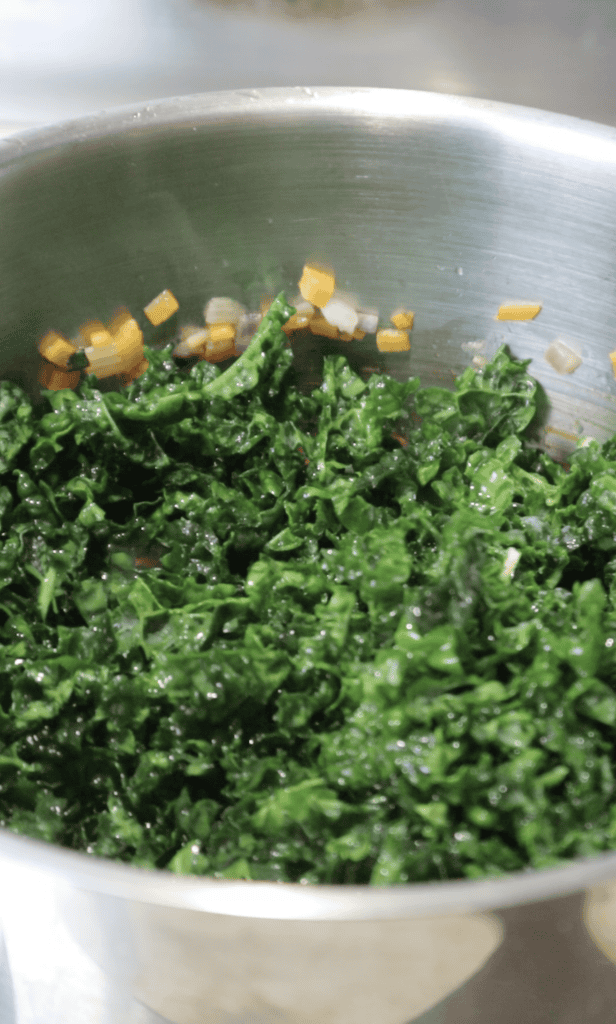 - Add tomato paste and thinly sliced cavolo nero. Cook for about 3-4 minutes, stirring until the kale softens slightly and deepens in color.