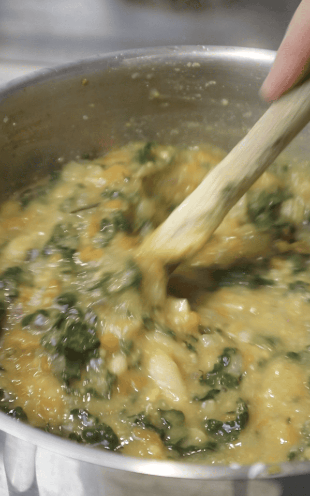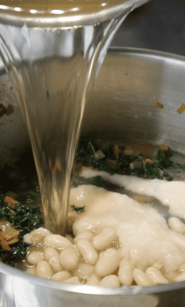 - Blend ½ cup of the beans until smooth with some water if necessary ,add the paste and the rest of thd beans to the pot. (this will help with natural creaminess). Pour in vegetable broth and bring to a gentle simmer. Season with salt and pepper