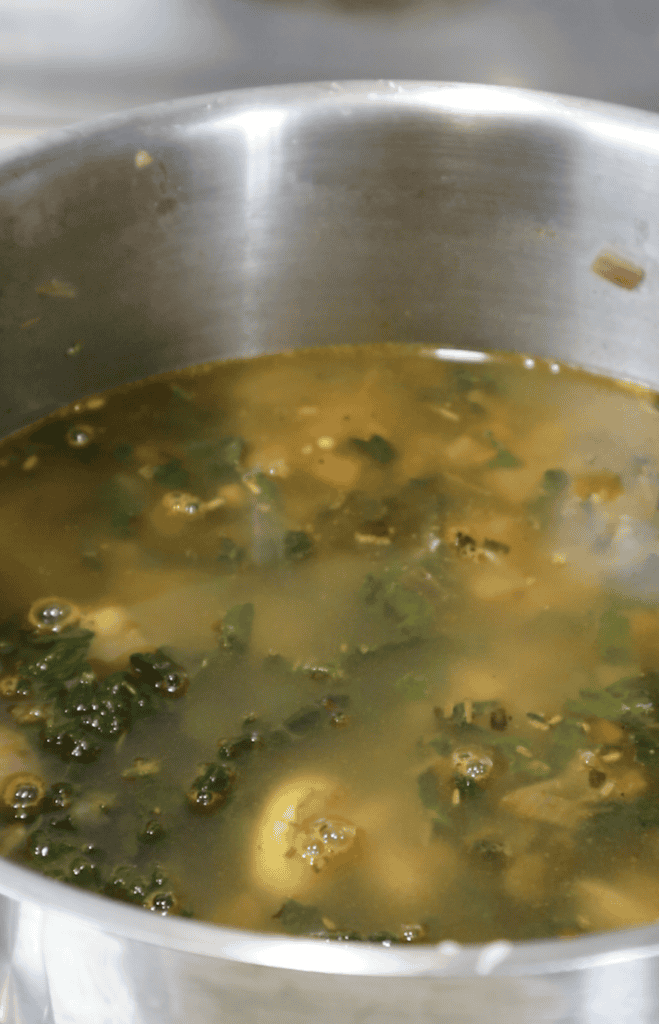 Blend ½ cup of the beans until smooth with some water if necessary ,add the paste and the rest of thd beans to the pot. (this will help with natural creaminess). Pour in vegetable broth and bring to a gentle simmer. Season with salt and pepper.