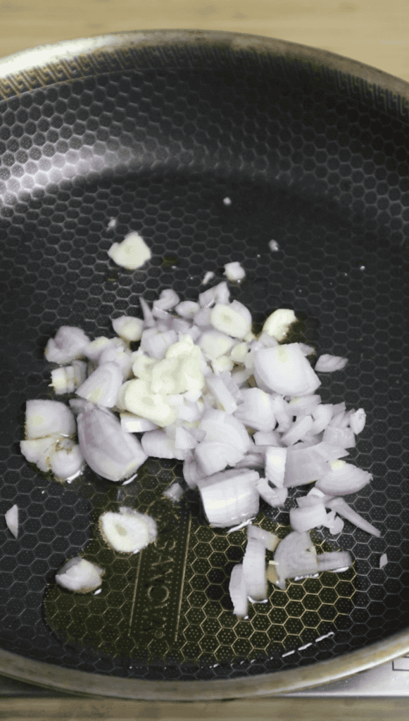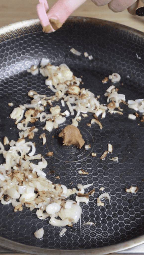 Gently sauté the garlic and shallots in a bit of extra virgin olive oil until they soften and become fragrant. Once they're softened, add miso paste and mix to combine.