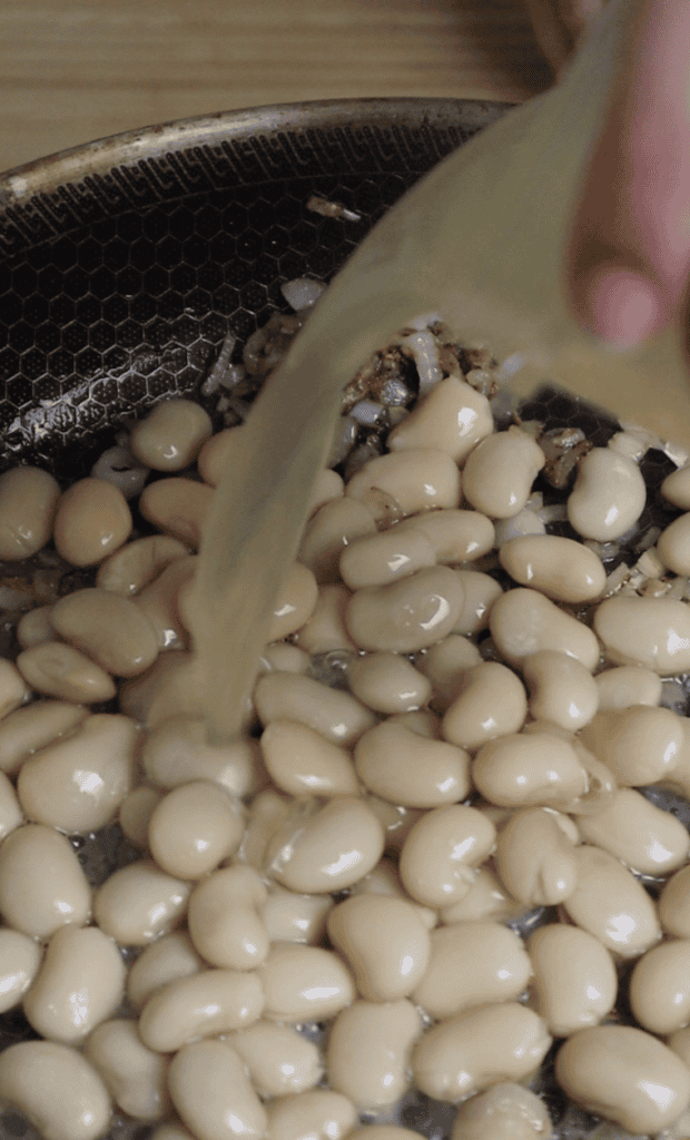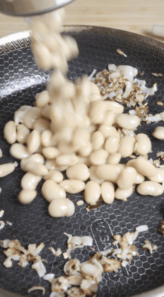 Add the canned beans to the pan along with a splash of their liquid. This helps thickening the sauce.