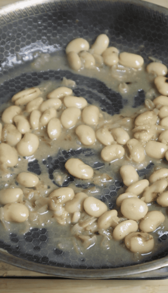 - Add the canned beans to the pan along with a splash of their liquid. This helps thickening the sauce.