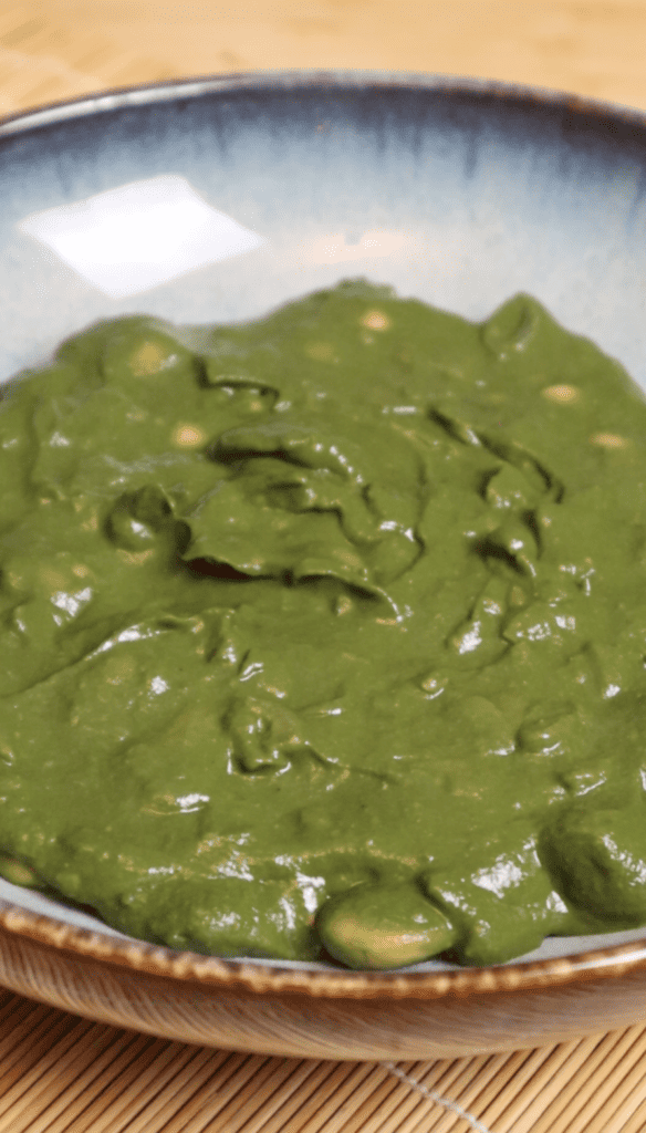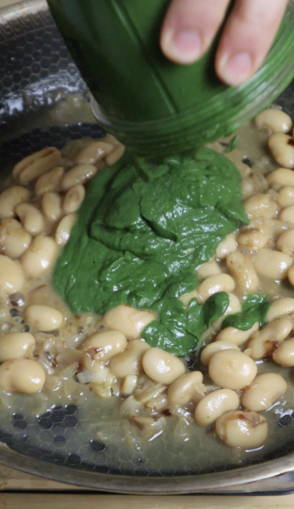- While the beans cook, make the sauce. To a blender add the cooked spinach,2 tablespoon of the bean mixture, nutritional yeast, and lemon juice. Blend adding 1 tablespoon of water at a time to create a creamy.