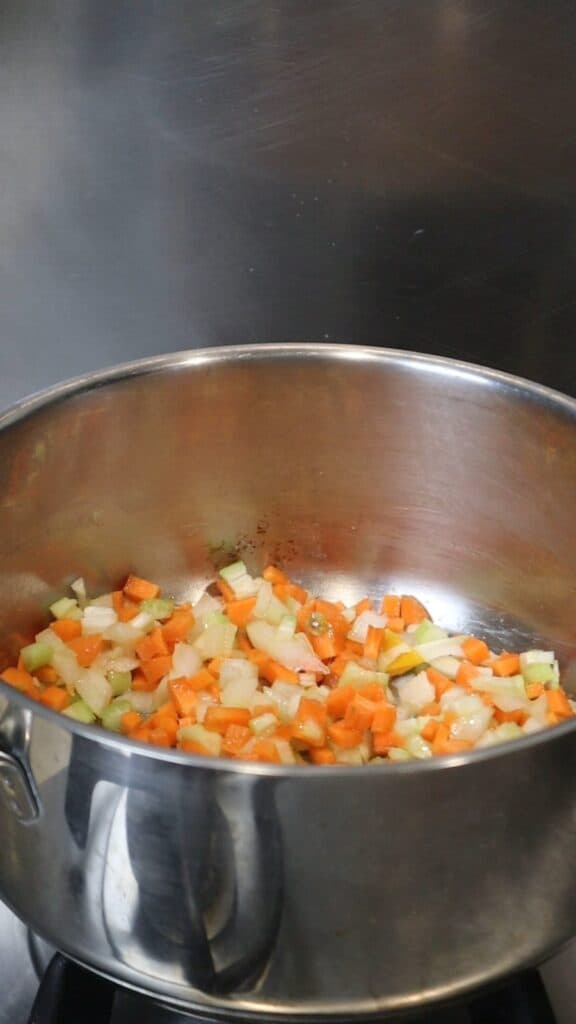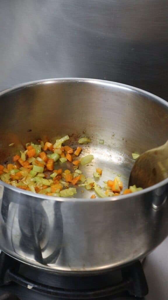 Heat 1 tablespoon of olive oil in a soup pot over medium heat. Add half the onion, carrot, and celery, plus a pinch of salt. Cook slowly, stirring occasionally, about 5-10 minutes until soft but not browned.