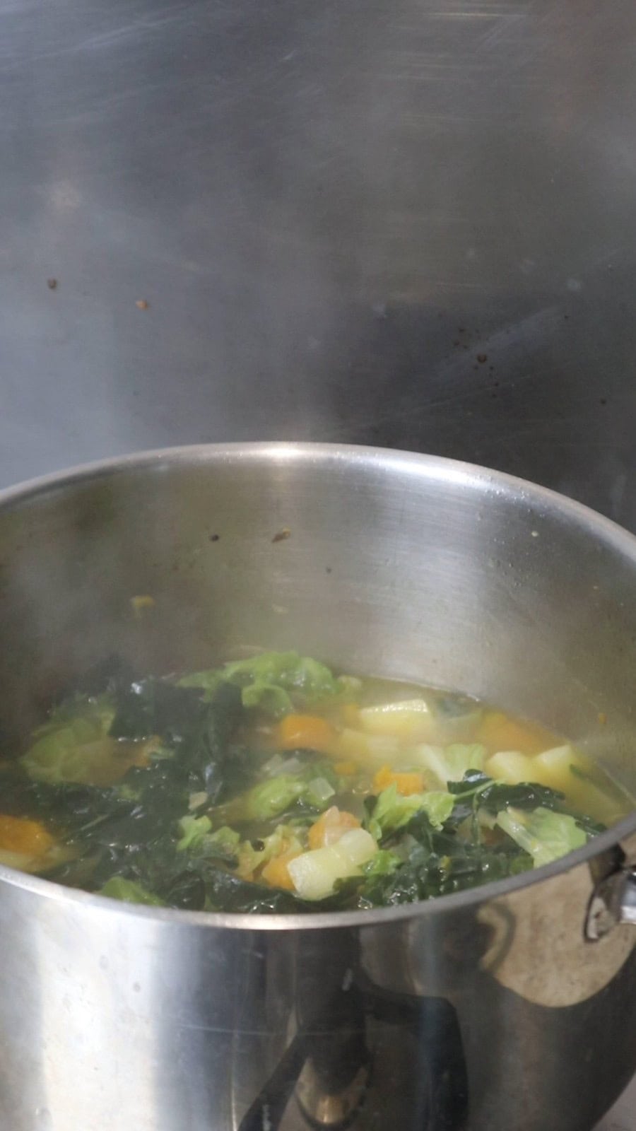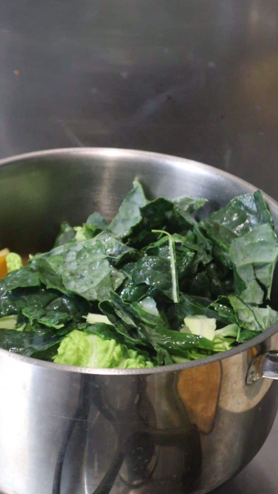 - Add chopped kale and cabbage to that pan. Pour in the vegetable broth, just enough so the vegetables are barely submerged. Cover and simmer for 10-12 minutes, until all vegetables are tender. (Depending on your preferred consistency you can remove some broth if too liquid)1.5 cups tightly packed roughly chopped kale, 2 cups tightly packed roughly chopped cabbage, 6-7 ladles hot vegetable broth