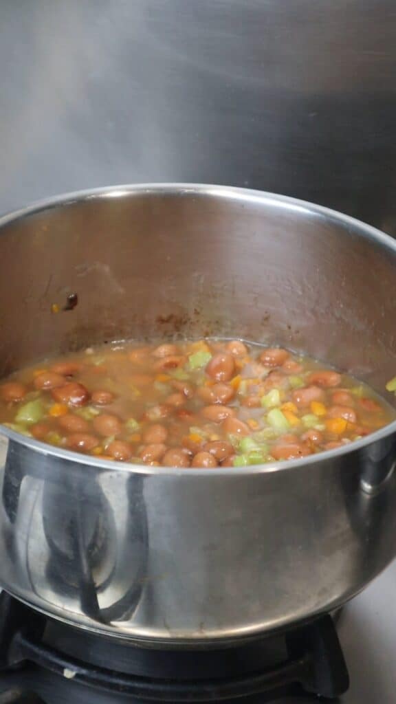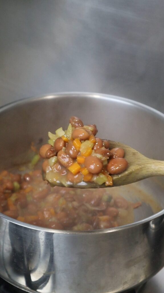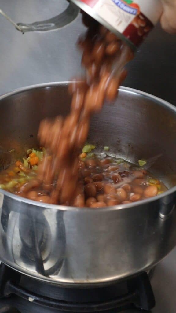 - Add the entire can of borlotti beans (including their liquid) into the pot with the soffritto (onion, carrot, celery) Stir gently. Reduce heat to low and let simmer.1 can borlotti beans