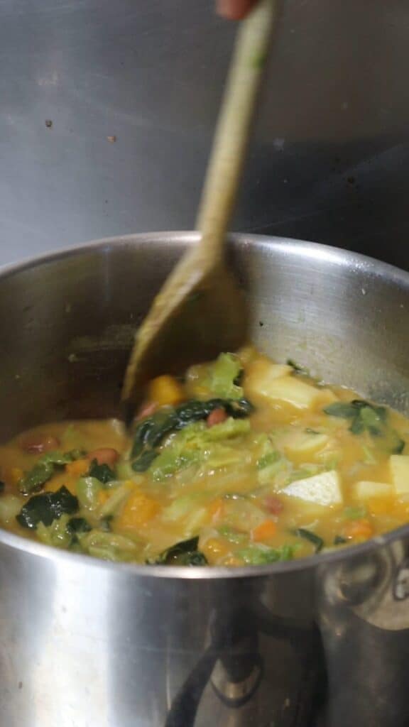 Add that back into the pot with the pumpkin, potato, and greens, along with the rest of the borlotti bean mixture.