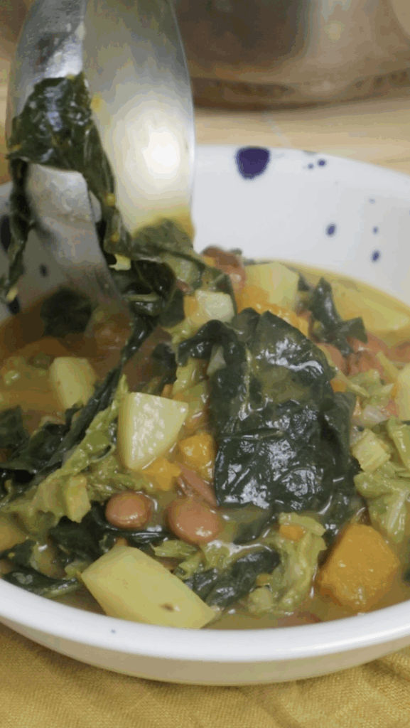 - Add that back into the pot with the pumpkin, potato, and greens, along with the rest of the borlotti bean mixture.