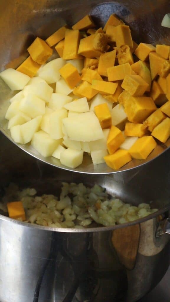- Meanwhile, in a separate pot, heat the other 1 tablespoon olive oil. Add the remaining onion and let it soften. As it starts to caramelize, add diced potato and pumpkin. Toss and allow them to take slight color for 2-3 minutes.